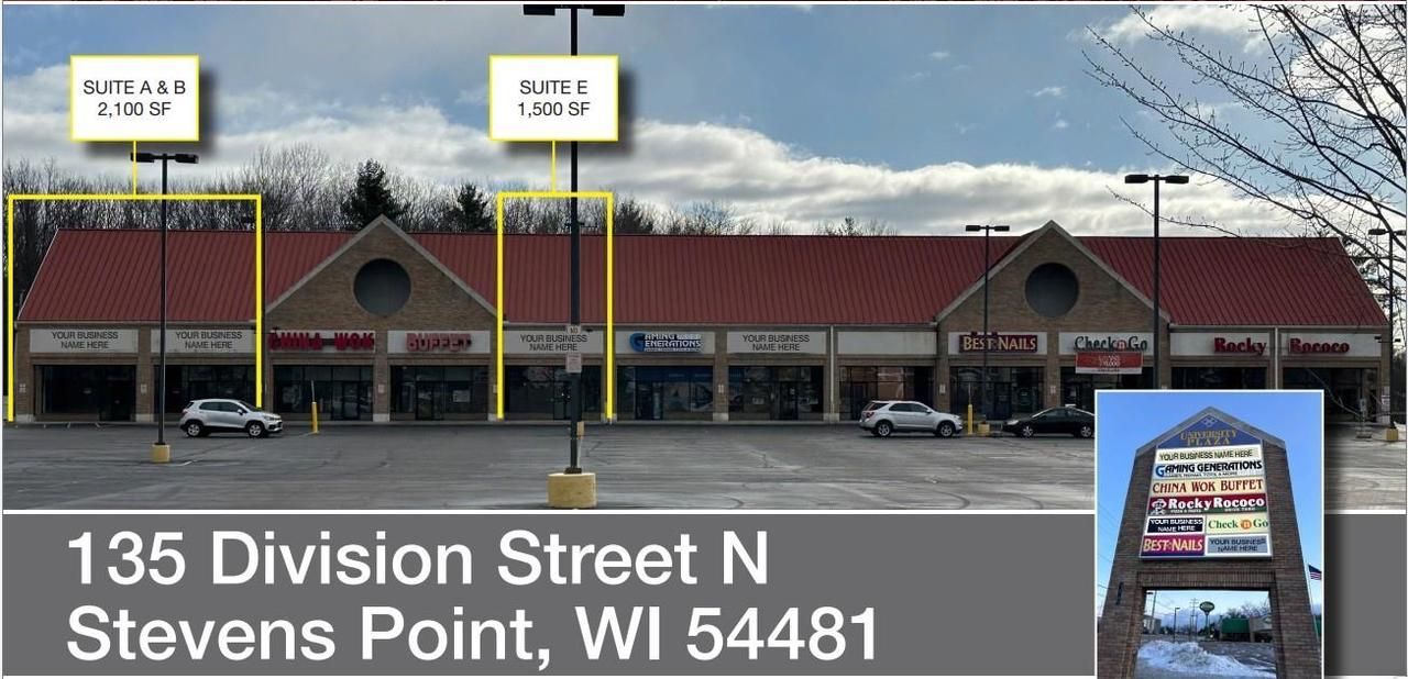 This retail center is located on the main thoroughfare and is adjacent to UW Stevens Point with an enrollment of 8,600+ students. These available suites are a short walk from Stevens Point's largest employer, Sentry Insurance, with over 2,200 employees. This property has a very large parking lot, nice signage on the building and has a pylon sign on Division Street. Join several area big brands including Starbucks, Kwik Trip, Noodles & Co, Cold Stone Creamery, McDonald's, Taco Bell, Pizza Hut, Papa Johns, and many more.,Directions: Heading northbound on I-39, when you reach Exit 161, take the exit for US-51 BUS. Once you exit, you'll encounter a roundabout. Take the appropriate exit in the roundabout to merge onto BUS 51. As you continue on BUS 51, you'll notice the retail center on your left-hand side.