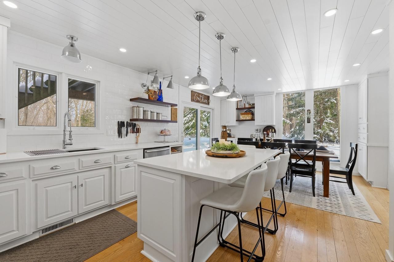 Tucked among 3 wooded acres, this inviting 4 bedroom, 21/2 bath home blends comfort & updates. A show-stopping white kitchen with an island opens to a warm living space ideal for entertaining. A cozy corner fireplace enhances the kitchen & soaring great room ceilings. Main-floor laundry & a half bath add everyday convenience just off the entry from the garage or backyard. A dedicated studio offers flexible space for an artisan or hobbyist. 2 car attached garage, 1 car detached, and extra 11x11 storage. Recent furnace & water heater provide peace of mind. Enjoy front & back decks plus a unique upper wrap-around deck with panoramic nature views. A teardrop-shaped drive allows for easy turnaround & ample parking. Just a short drive over the escarpment to with scenic lake views on your commute.